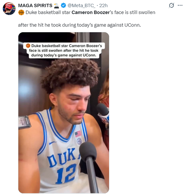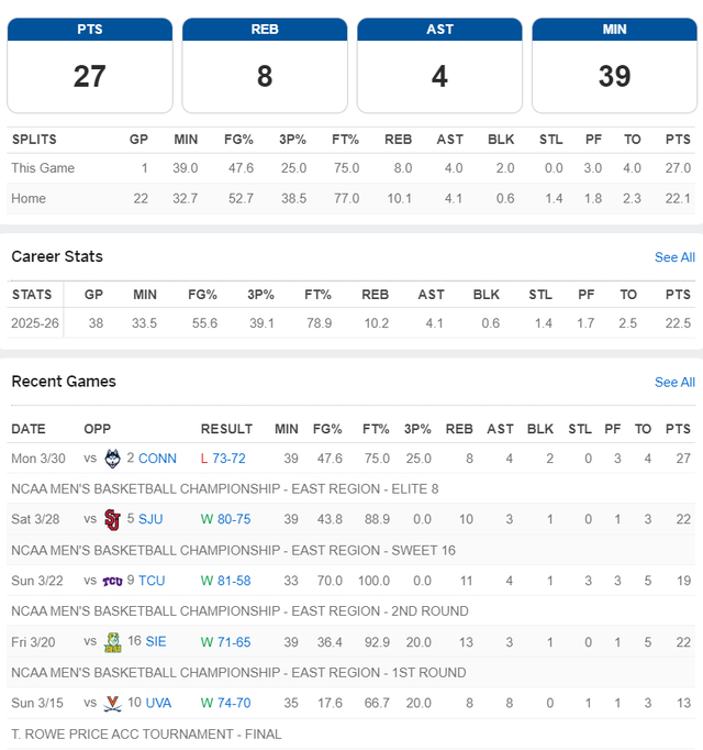在NCCA疯狂三月精英八强赛中,卡梅隆-布泽尔全场比赛39分钟,21中10,三分4中1,拿到27分8篮板4助攻4失误2盖帽,命中率47.6%。但杜克大学在终场前6.5秒领先2分还手握球权的情况下,卡梅隆的弟弟凯登传球失误,最终康大的马林斯超远三分绝杀。这场比赛后卡梅隆-布泽尔在采访中眼含热泪:这感觉太糟糕了,我们的球员们付出了很多。有的人带伤作战,有的人从手...