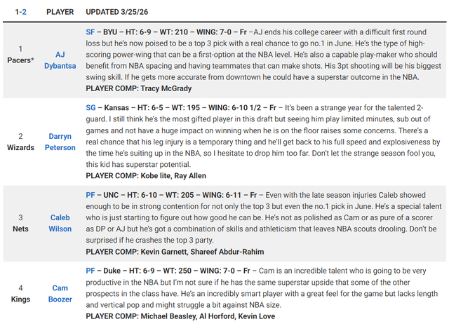 而在DX的预测上,布泽尔的预测顺位是第四,最终是由国王选中他。状元的人选都是杨百翰大学的迪班萨,看起来四号位的布泽尔被看衰前景。